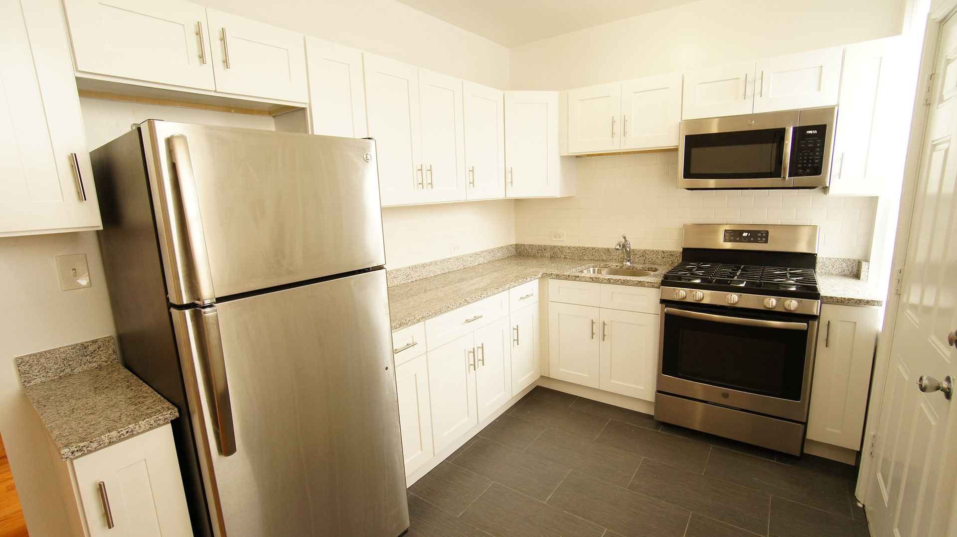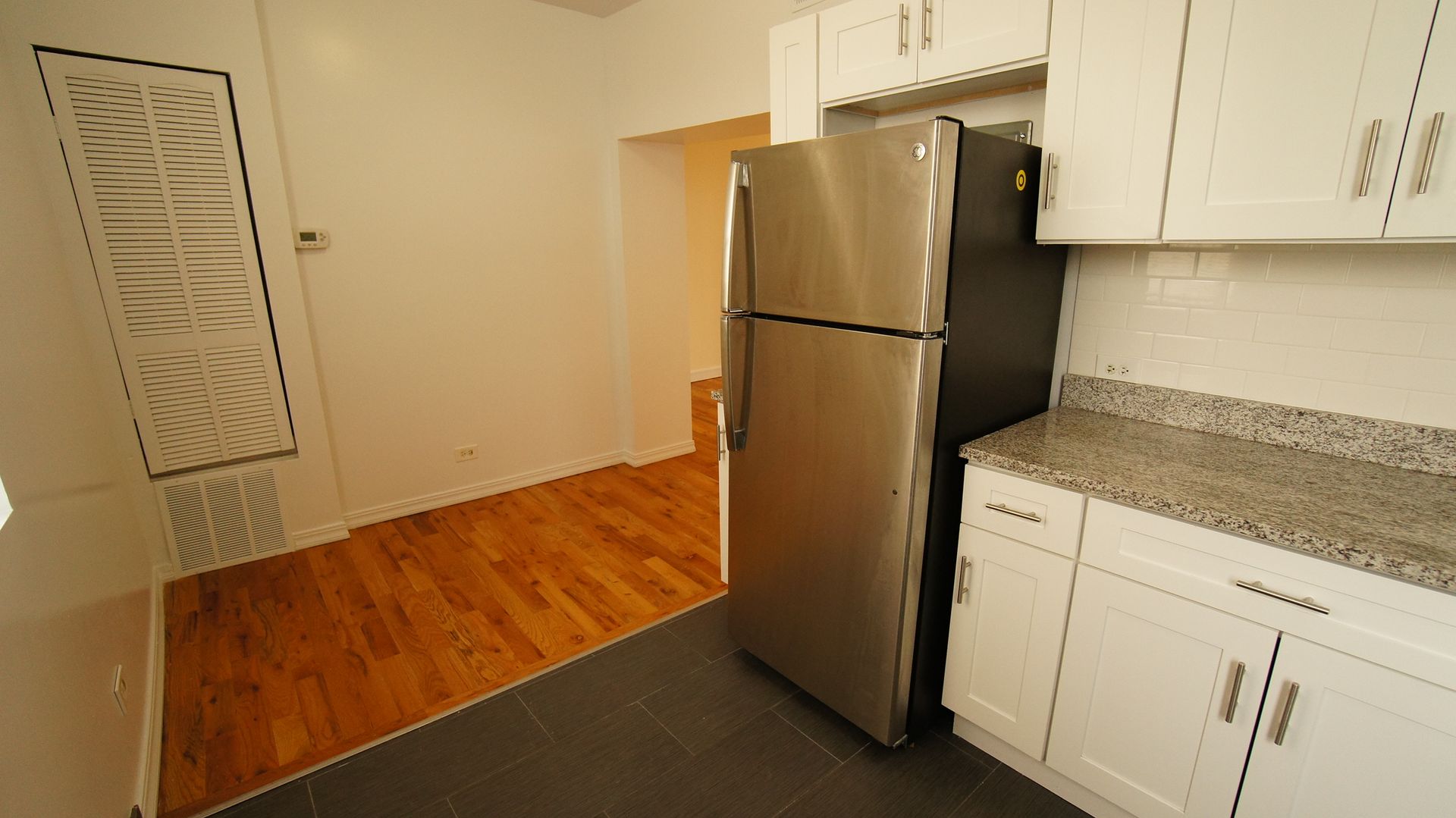 This unit features a large modern living space with hardwood floors, a large bedroom, an updated kitchen equipped with stainless steel appliances and quartz counter tops. The updated bathroom has stone tile and a modern vanity.